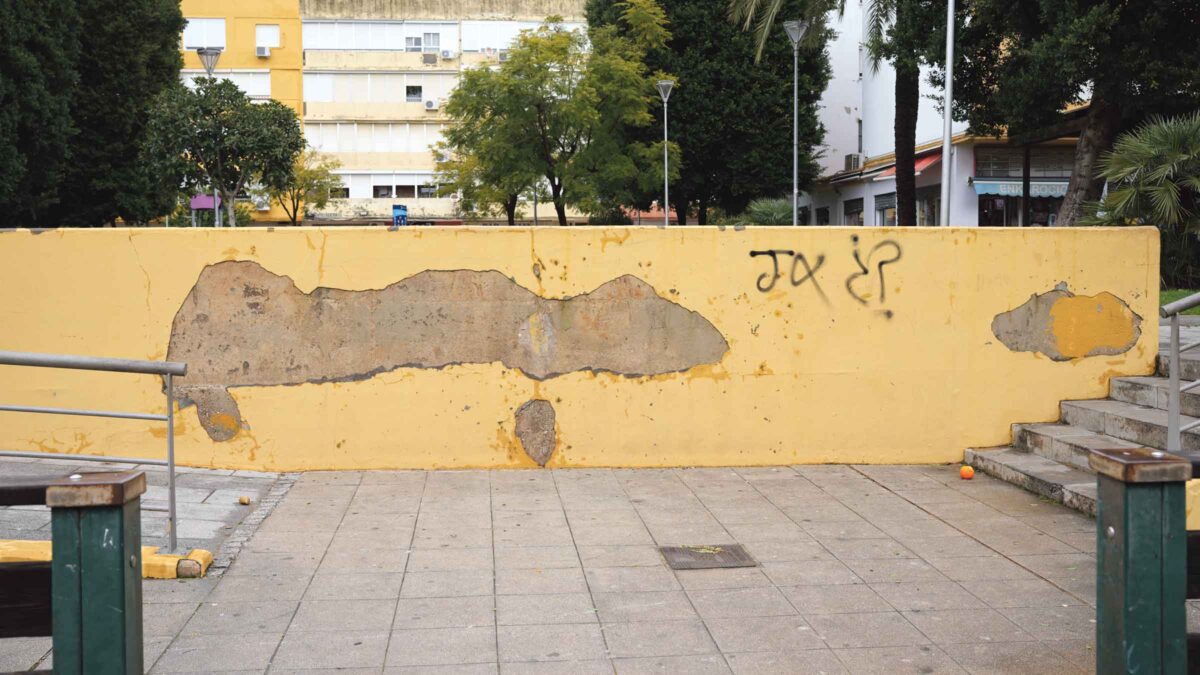 La entrada de la plaza situada junto a la calle Antonio Guerra Ojeda y la calle Doctor Marañón presenta un estado de abandono y deterioro preocupante. El muro pegado a las escaleras y la rampa de acceso está marcado por grietas, desconchones y restos de pintura que afean la imagen del parque infantil que emplaza. A la escena se suman pequeñas pintadas, señales de un espacio urbano necesitado de atención.