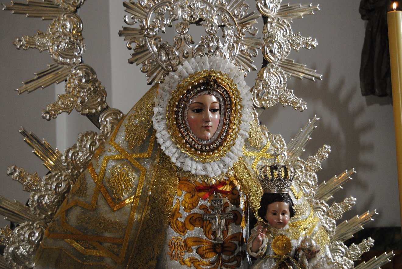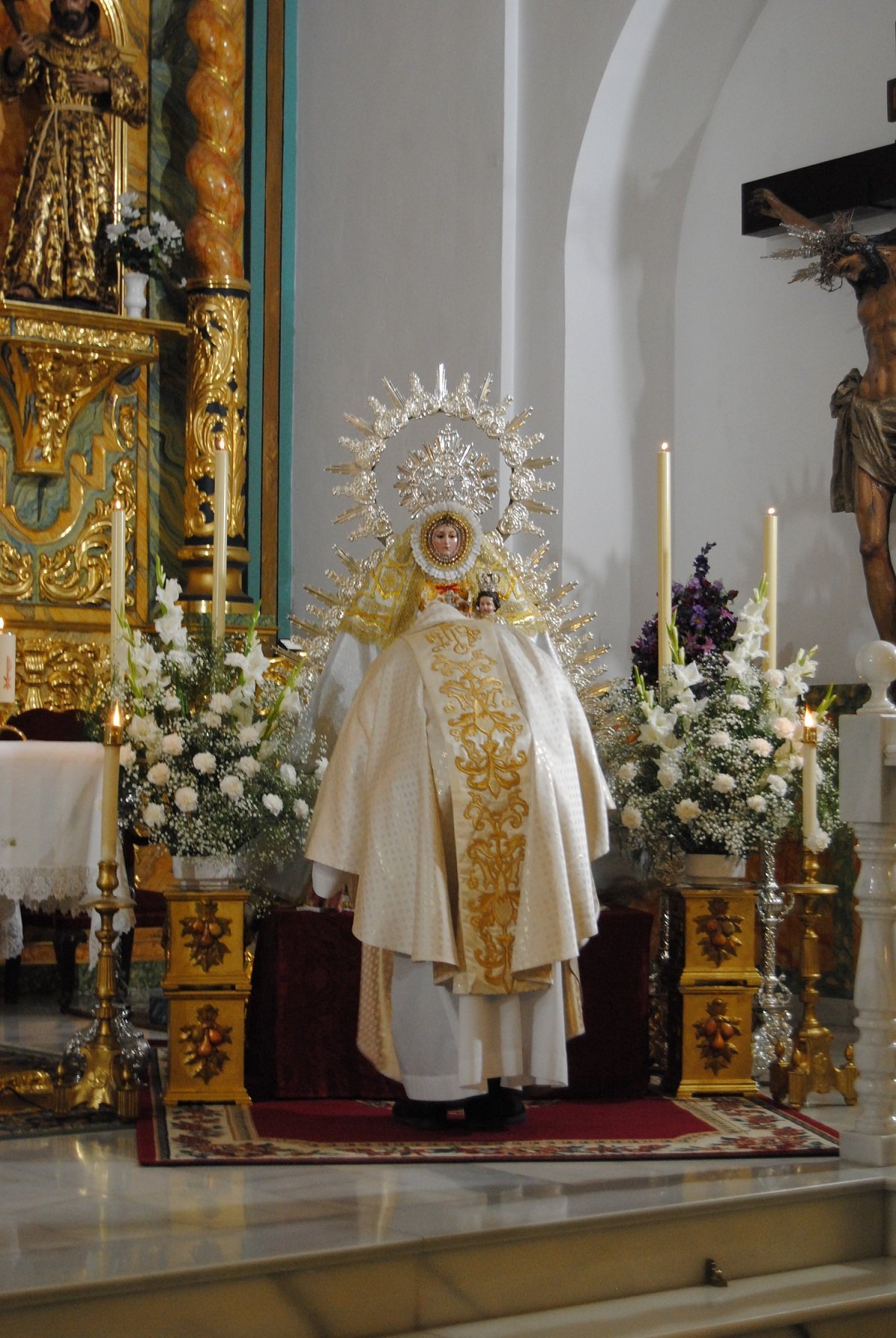 En esta ocasión, la Sagrada Imagen se encontraba colocada en el presbiterio, en el lado de la epístola, vestida de blanco, con un traje de tisú de plata, que, junto con la ráfaga de rayos que orla todo su contorno, resaltaba aún más su condición de “mujer vestida de sol…”, como la describe el Libro del Apocalipsis. Lucía en el pecho la cruz pectoral que en 2017 le regalara el Eminentísimo y Reverendísimo Fray Carlos Amigo Vallejo, Cardenal del Título de Santa María de Montserrat de los Españoles, y Arzobispo Emérito de Sevilla, que es, a la sazón Presidente Honorario de la Sección Alcalareña. Y un broche de oro regalado en 2014 por una devota con el anagrama del nombre de María, de traza modernista, en razón de que su familia procedía de Utrera y de Carmona, lugares en los que se honra como Patrona a la Santísima Virgen con esos dos Títulos: Consolación y Gracia.