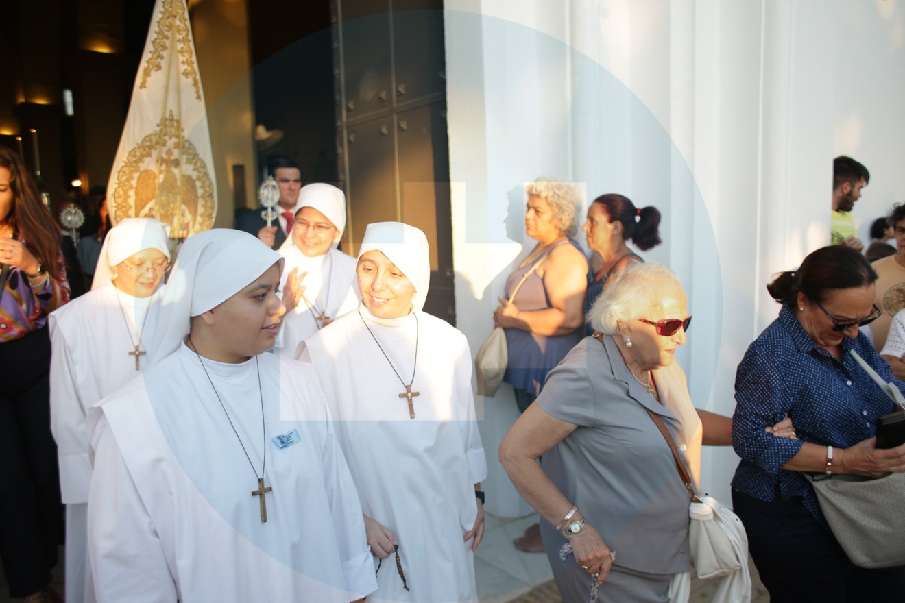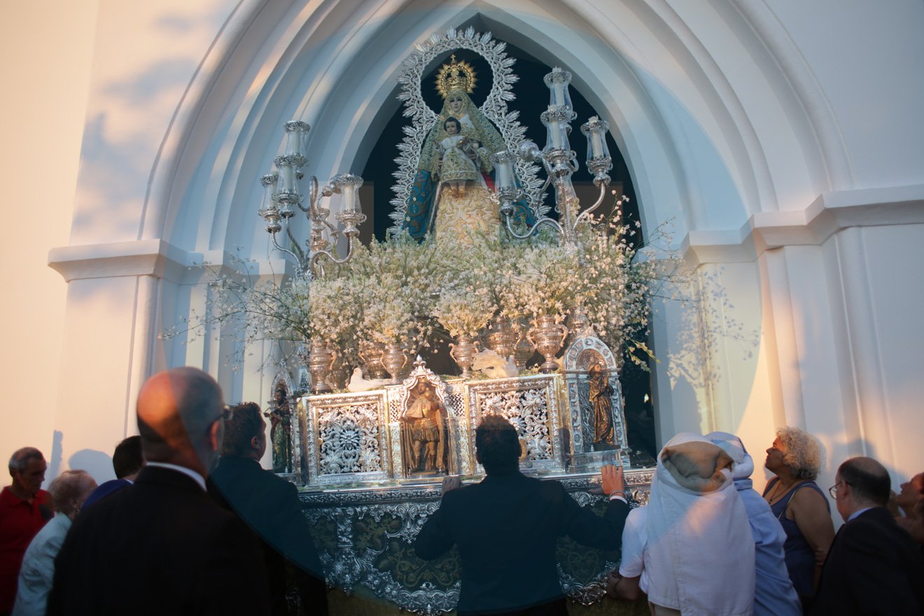 Como cada 15 de agosto, día de la Asunción de María, de forma puntual, coincidiendo con el ocaso, se abrían las puertas del Santuario para dar comienzo a una procesión más que esperada. Con el cortejo ya en la calle, y tras una salida complicada, los costaleros del Perdón ponían a la Virgen del Águila en la calle. Tras la primera revirá con el sol cayendo de telón de fondo, avanzaba para bajar por la Cuesta de Santa María, camino del Centro. Allí, en la calle Herreros, engalanada para la ocasión por los vecinos y el grupo joven de la Hermandad, le esperaba una petalada. Una tradición perdida que lleva camino de recuperarse y consolidarse.