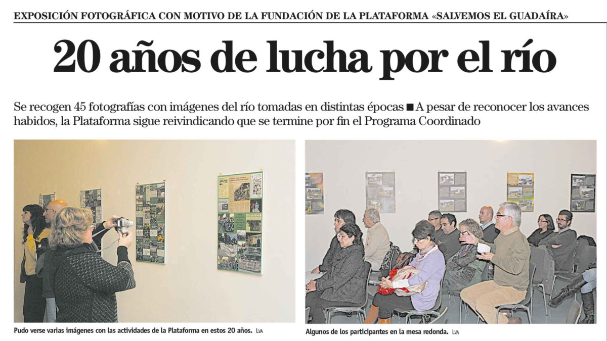 Hace trece años, La Voz de Alcalá publicaba una noticia que celebraba dos décadas de lucha por la recuperación del río Guadaíra. Bajo el título 20 años de lucha por el río, el periódico recogía la inauguración de una exposición fotográfica organizada por la Plataforma Cívica Salvemos el Guadaíra con motivo de su vigésimo aniversario. El reportaje destacaba cómo cada avance logrado en la cuenca era fruto del esfuerzo sostenido de un movimiento ciudadano que llevaba desde 1992 reclamando el cumplimiento íntegro del Programa Coordinado, aprobado en 1996 y con fecha prevista de finalización en 2003.