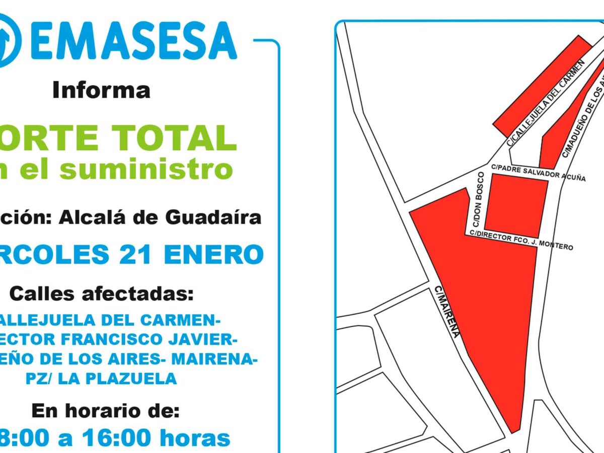 Emasesa ha informado de un corte total en el suministro de agua que afectará a varias zonas de Alcalá este miércoles 21 de enero, con motivo de trabajos programados en la red. La interrupción del servicio se producirá en horario de 08:00 a 16:00 horas y afectará a las calles Callejuela del Carmen, Director Francisco […]