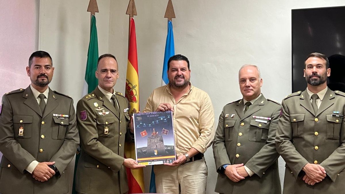 El delegado de Gobernación del Ayuntamiento, Pedro Gracia, recibió de manos del jefe del Batallón de Transmisiones III/22 del Ejército de Tierra, Vicente Rodríguez Polvillo, junto a otros mandos militares, el cartel anunciador de la ‘IX Edición del Camino de San Fernando’.