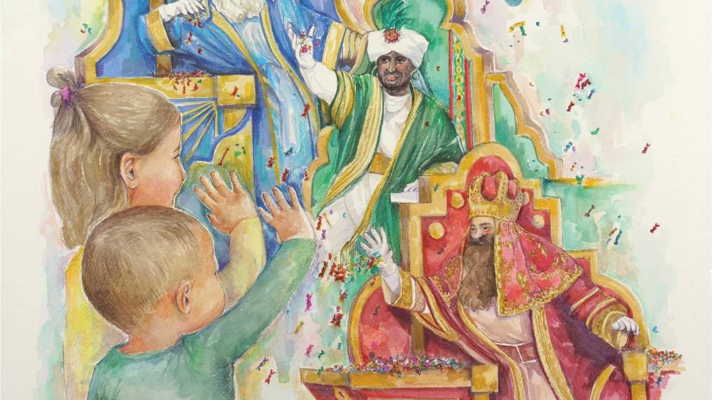 El cartel muestra a Melchor, Gaspar y Baltasar saludando desde sus tronos, envueltos en un ambiente cargado de luz y fantasía. La autora recurre a los colores tradicionales y a expresiones cercanas para representar a los tres monarcas, reforzando ese vínculo afectivo que tantos niños y adultos sienten hacia ellos.
