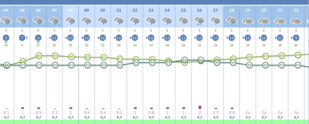 A partir de media tarde, las precipitaciones seguirán presentes de forma débil, con acumulados alrededor entre los 0,7 y los 0,8 l/m² hasta las 22:00 horas. La probabilidad de lluvia se mantiene alta durante toda la franja diurna, situándose por encima del 90%.
