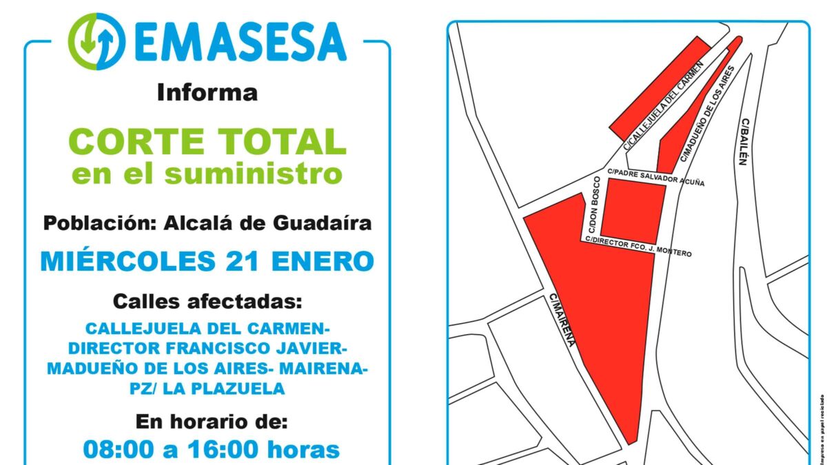 Emasesa ha informado de un corte total en el suministro de agua que afectará a varias zonas de Alcalá este miércoles 21 de enero, con motivo de trabajos programados en la red.
