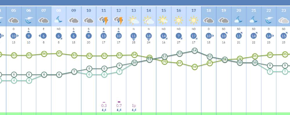 El tramo más inestable del día se espera entre las 6:00 y las 12:00 horas, cuando el cielo permanecerá muy nuboso, con tormenta y lluvia escasa, y una probabilidad de precipitaciones del 75%. Según la Aemet, los episodios de lluvia más relevantes se producirán en torno a las 11:00 y las 12:00 horas, con posibilidad de fenómenos tormentosos.