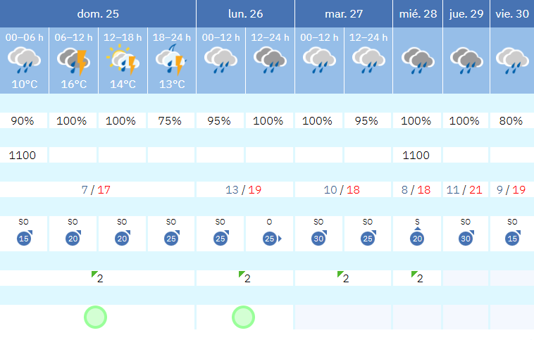 De cara al resto de la semana, la tendencia general sigue marcada por la lluvia: el avance diario de Aemet mantiene probabilidades muy altas (95%-100%) al menos hasta el martes 27, y un escenario todavía húmedo en la segunda mitad de la semana. En cuanto a temperaturas, se esperan valores contenidos, con máximas en torno a 17-19º al inicio y un ligero repunte hacia el jueves.