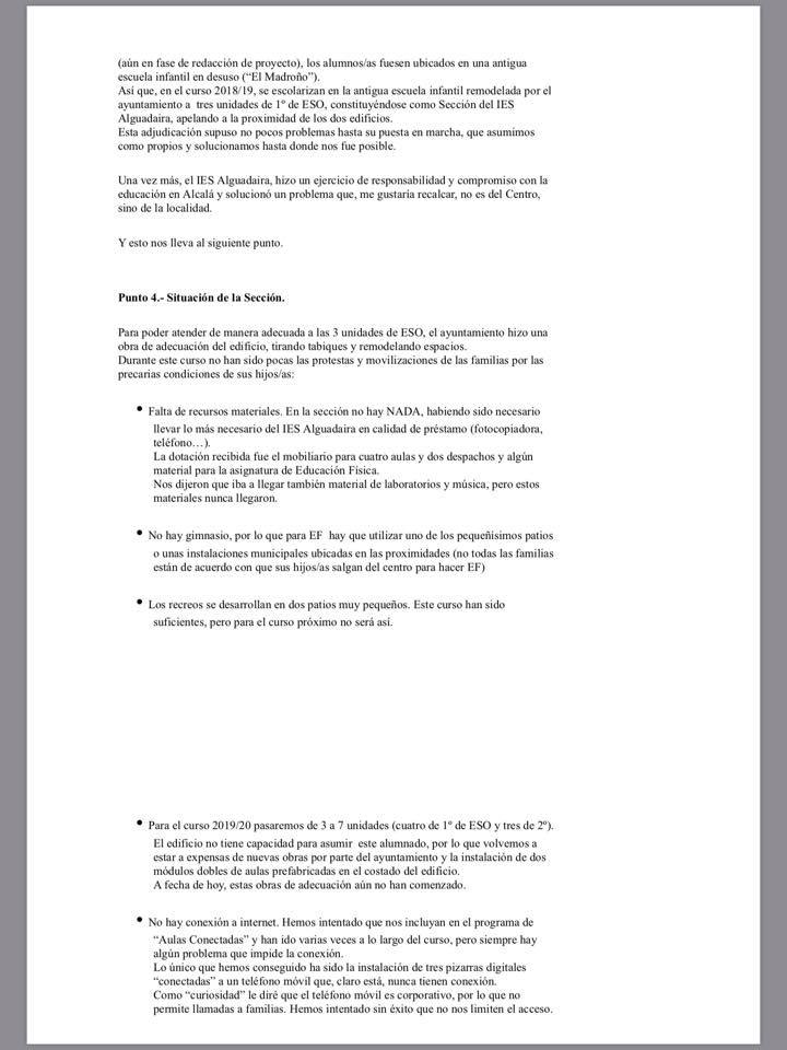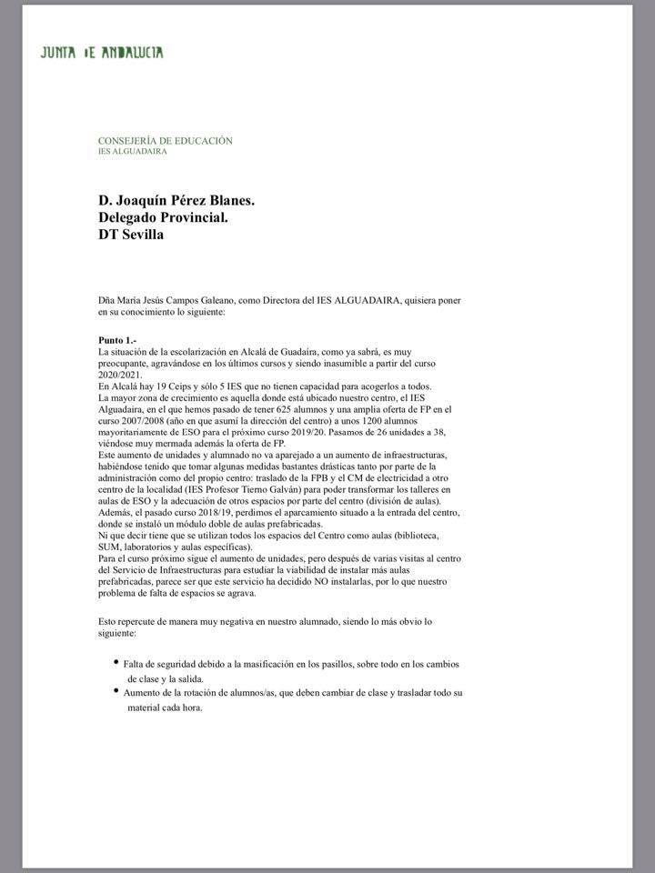 La situación de la educación Secundaria en Alcalá se agrava con el colapso de El Madroño. El centro de infantil que se adaptó el pasado curso para acoger tres líneas de 1º de ESO también se ha quedado pequeño, puesto que el próximo curso tendrá que asumir cuatro nuevas líneas que se suman a las que ya tenía, siete en total. La directora del Alguadaíra, centro al que se adscribió esta sección, señala en el escrito que «el edificio no tiene capacidad para asumir el alumnado, y se vuelve a estar a expensas de nuevas obras por parte del Ayuntamiento y la instalación de módulos dobles de aulas prefabricadas en el costado del edificio». «Obras que no han comenzado», subraya.