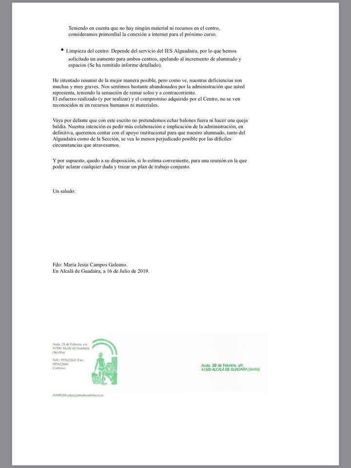 La directora del IES Alguadaíra, María Jesús Campos, ha puesto en conocimiento del delegado provincial de Educación, Joaquín Pérez Blanes, la situación de «abandonado» de su centro por la administración.