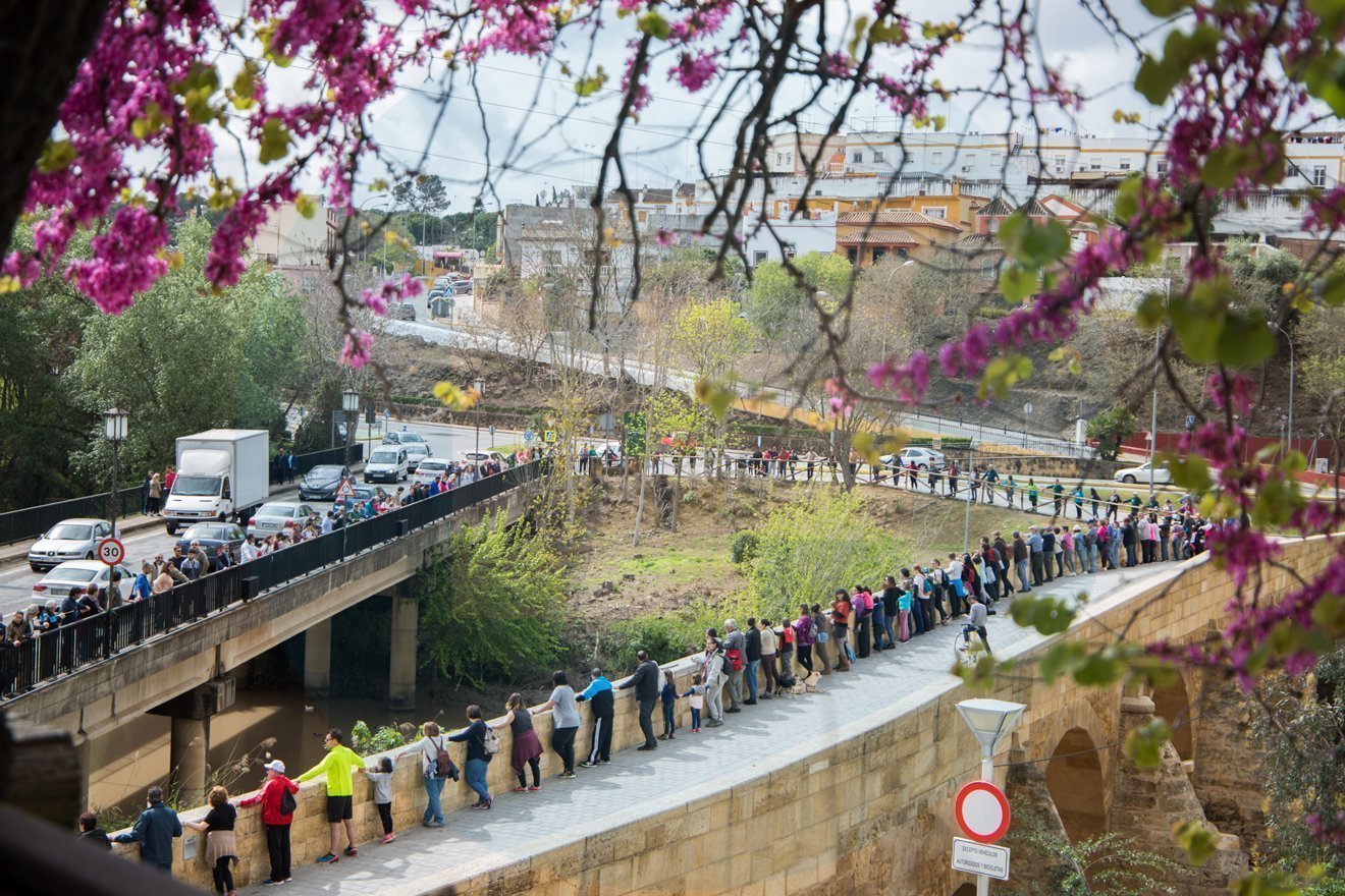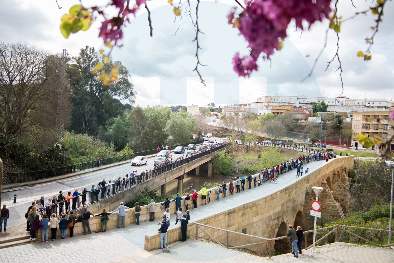 Más de doscientas cincuenta personas participaron en la cadena humana convocada por la Plataforma Cívica “Salvemos el Guadaira” en el puente de Carlos III de Alcalá de Guadaíra. El acto, que se inició con una ruta senderista, concluyó con la lectura de un manifiesto por parte de un joven del grupo scout “Qalat Chabir”. En el manifiesto se hacía referencia al río Guadaíra como elemento vertebrador de toda la cuenca y como seña de identidad de Alcalá de Guadaíra, que acumula una inmensa riqueza natural y patrimonial; a los logros alcanzados gracias al esfuerzo de todos con el Programa Coordinado de Recuperación y Mejora del río Guadaira y cómo este programa fue cerrado en falso por la Consejería de Medio Ambiente de la Junta de Andalucía, la Confederación Hidrográfica del Guadalquivir y los ayuntamientos. Igualmente, se informó de las gestiones que está realizando la Plataforma para lograr el deslinde del tramo de ribera comprendido entre el molino de Las Aceñas y el molino Hundido.