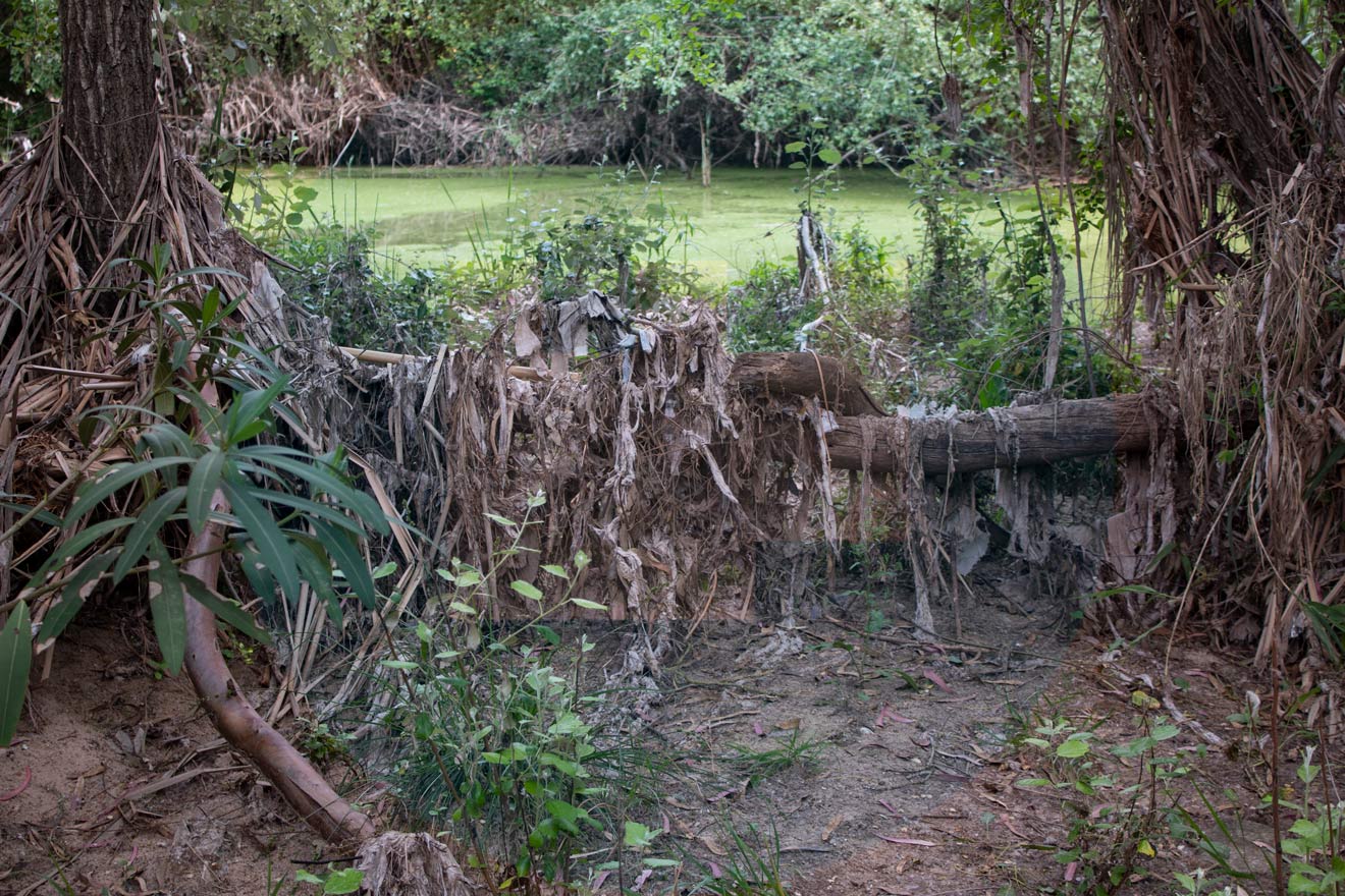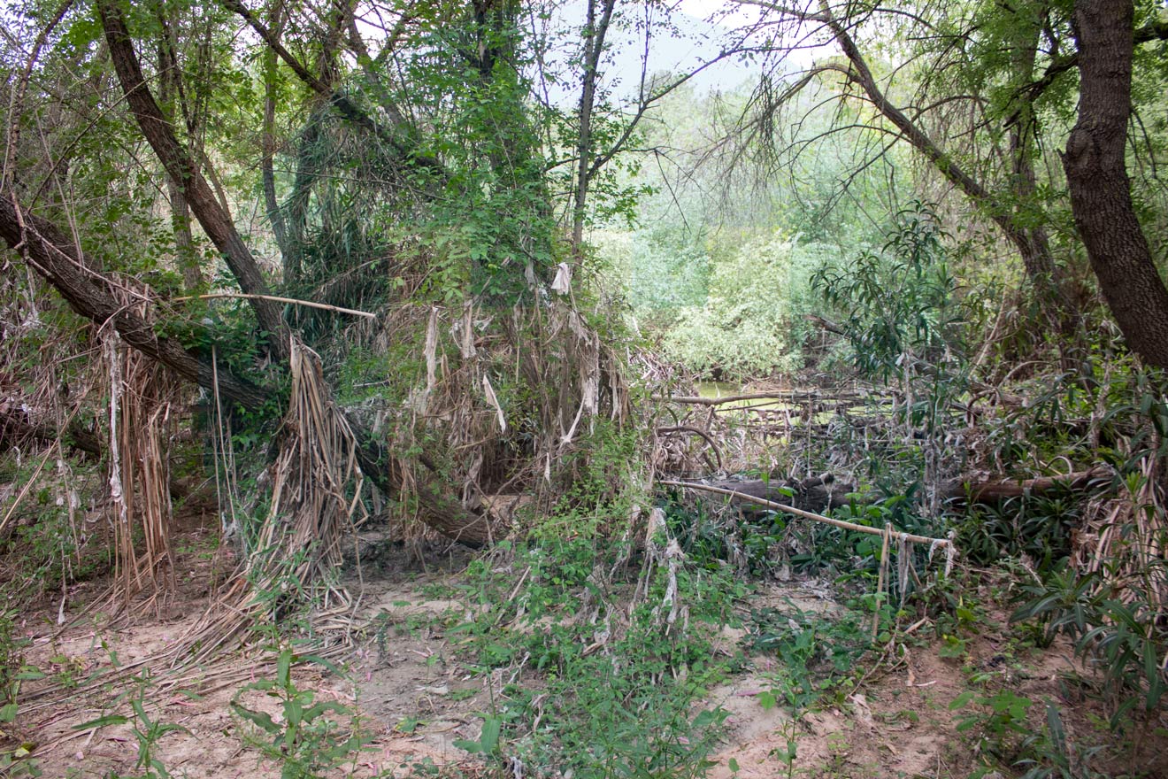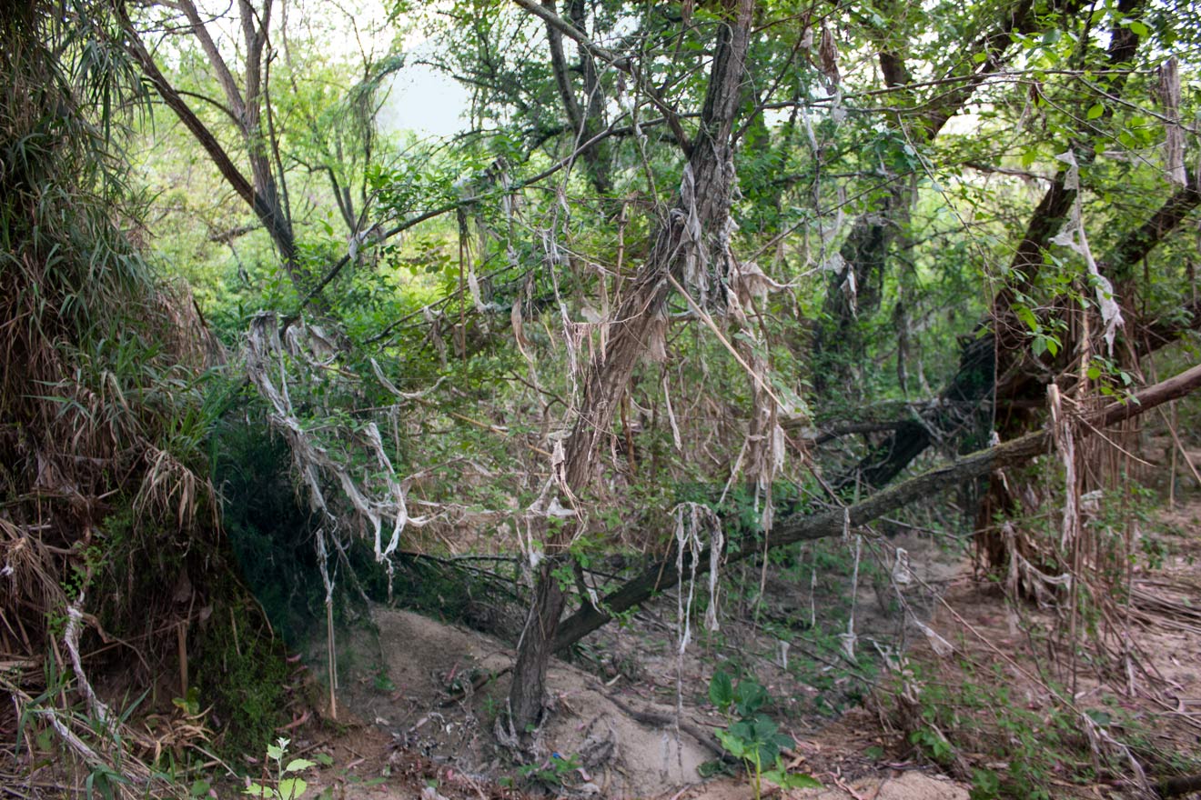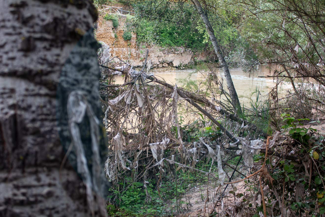 Tras las últimas crecidas del caudal del río han salido a flote cientos de «toallitas» de higiene personal que se han acumulado en las ramas de los árboles y arbustos de la ribera del Guadaíra.